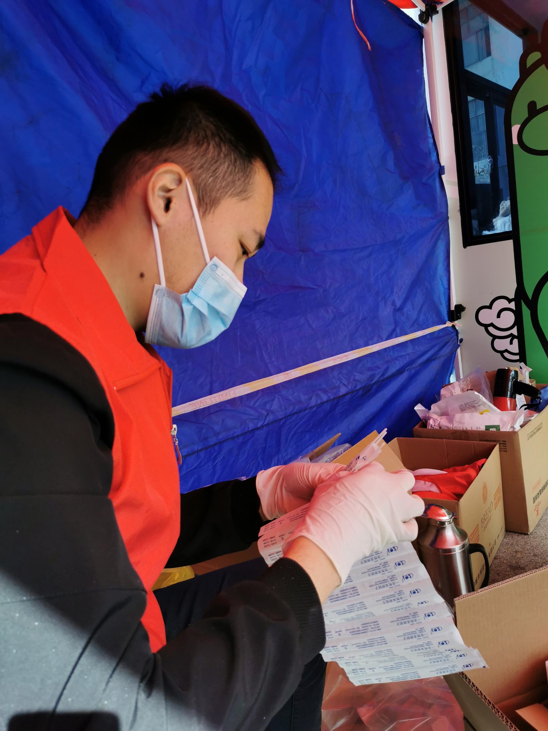 在薛家島街道青云山路社區(qū)服務(wù)的黨員孫建強,沖在一線、干在一線,協(xié)助社區(qū)開展核酸檢測工作。據(jù)孫建強介紹,他負責(zé)一次性檢測棒的拆裝工作,拆開檢測棒,交給采樣工作人員。一邊拆,一邊監(jiān)測,流水線作業(yè),提高檢測效率。這樣一項看上去很簡單的工作,孫建強一做就是兩三個小時。